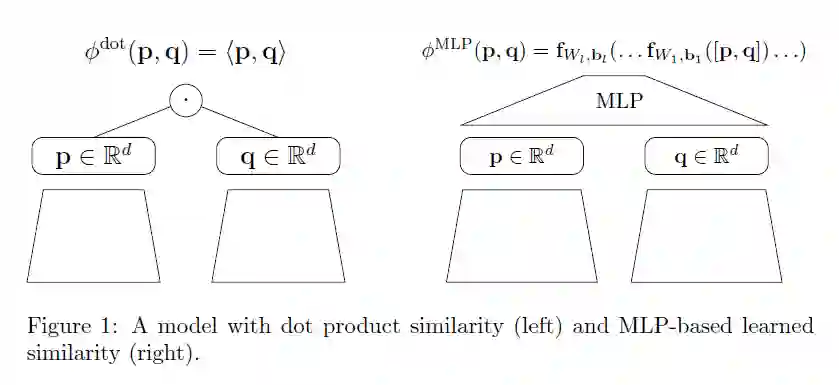 直觉上,将矩阵分解模型里的点积替换为MLP应该至少不会得到更差的效果。因为点积操作在带来归纳偏置的同时也限制了模型的表达能力,拥有更强表达能力并在理论上能拟合任意函数的MLP应该是更好的。但这只是最理想的情况。如果考虑到实际场景中可用的数据,这种直觉就未必正确,这也是Rendle这篇文章里试图通过实验论证的一个点。