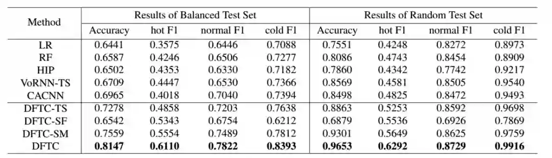 此外,跟模型自身的简化版(DFTC-TS 只包含时序预测部分,DFTC-SF 只包含内容建模部分,DFTC-SM 包含时序和内容建模但不包含注意力融合机制)对比中,最终版模型 DFTC 同样取得了最佳效果。
