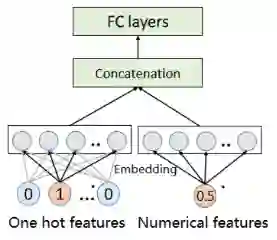 在线文章的内容特征(文章是否写的用心,公众号受众是否大等)很大程度上决定了它们能否受到大众喜爱。元数据特征包括独热编码特征,如类别,也包括数值型特征,如发布账号的粉丝数量。因此我们利用embedding技术将这些特征嵌入到同源dense vector中,并将FC layer应用于特征组合,得到总体的元数据表示向量he。