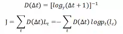 在训练的过程中,我们选取预测得分最高的类别作为流行度水平(热门,冷门,正常)的预测结果,采用Adam优化算法以及我们提出的时间衰减损失函数作为优化目标在训练集上训练。由于在实际应用中,预测早期的整体流行度更有价值。此外,观察到的受欢迎程度与整体受欢迎程度之间的内在关系使得在后期更容易进行预测。为了帮助模型在早期阶段投入更多精力来优化预测性能,在训练过程中,我们将时间衰减因子D(Δt)乘以单步的交叉熵损失的加权和作为最终的损失函数。时间衰减因子D(Δt)是t与发布时间之间的时间间隔Δt的单调非增函数,D(Δt)与损失函数J的具体形式如下: