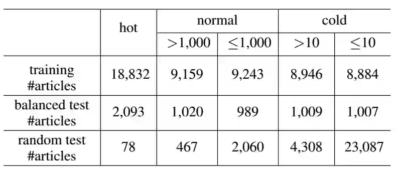 我们收集了 2018 年 5 月-7 月的 6 万篇微信公众号文章的热度数据,将文章热度分为 3 类,爆款(阅读量>10000),冷门(阅读量<100)和普通 (其它)。由于文章阅读量分布是一个极端幂律分布,我们采用分段降采样的方式,得到一个类别基本平衡的数据集作训练 (training set) 和测试 (balanced test set),此外还根据按照真实分布采样了 2 万篇文章作为另一个测试集 (random test set). 数据集统计情况如下: