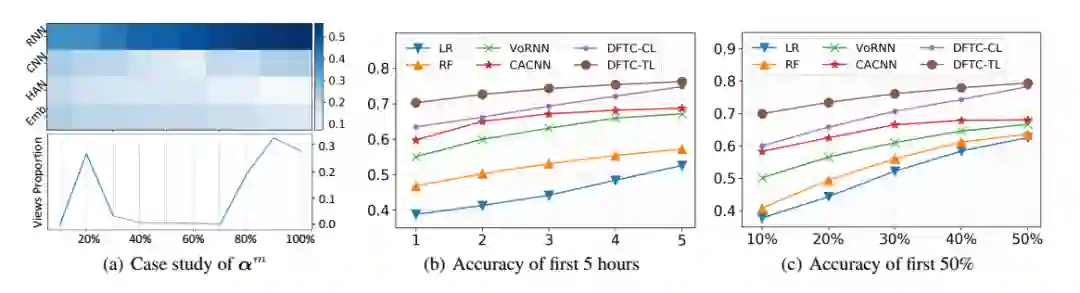 最后,在文章热度预测问题上,我们更关注于在文章发布初期的预测性能。图 3(b) 和图 3(c) 分别是文章发布后前 5 个小时的平均准确度和观察到的热度达到最终热度 10%-50% 时的平均准确度,可以看出我们的方法在文章发布早期获得了显著提升。特别是加了时间衰减因子后的模型 (DFTC-DL)。