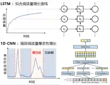 在时序过程建模中,我们将每篇文章的每5分钟的“阅读”,“浏览”,“分享”,“收藏”,“喜欢”和“打赏”等行为的统计量作为时间序列特征,这里要求时间序列长度不小于12,即至少有1小时的观察时间,记为{v1,v2,...,vt},采用LSTM对长期增长趋势进行建模,同时采CNN捕获短期波动。