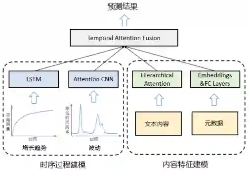 文章的用户行为会受外界因素影响而产生难以预测的短期性波动,文章的文本和元数据特征通常包含多种模态,也增加了建模的难度。我们将整体模型设计为用户行为时序过程建模和文本特征建模两部分。在时序过程建模中,我们采用LSTM和CNN分别建模流行度演变过程中的长期变化趋势和局部短期波动。在内容特征建模中,利用层次Attention网络和embedding多模态的元数据特征。最后,采用时序注意力融合单元来动态地整合以上子网络。