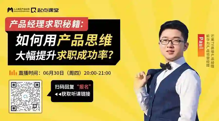为了让各位朋友们少走弯路、最大化提速自己的成长和求职进度,今晚8点,【人人都是产品经理】联合【起点课堂】特邀芒果TV高级产品经理、前华为产品运营经理@Paul,做客“起点课堂产品经理入门公开课”,针对以上这些问题,直播分享【产品经理求职秘籍:如何用产品思维大幅提升求职成功率?】,手把手带你了解如何活学活用产品思维!