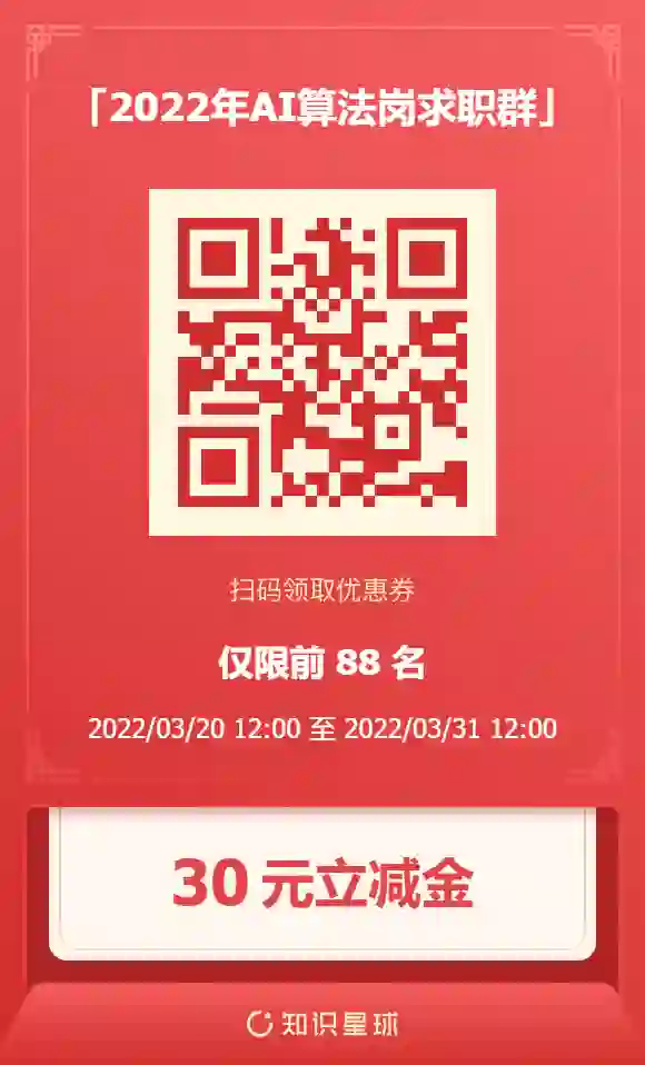 之前优惠券都被抢光了!CVer 在此特别赠送 88 张 AI算法岗求职群(知识星球)30元优惠券!今年最大的优惠力度!今年、明年和未来几年要找工作的同学们可以抢起来了~注:2022年是针对2022届、2023届,但星球一直不会变(24届及以后都会在里面),里面的内容永存!