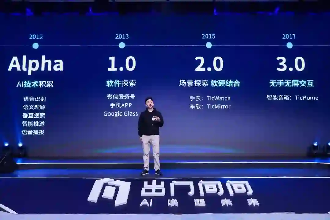 出门问问CEO李志飞在新品发布会上介绍了出门问问公司的发展历程。2012年,公司主要专注AI技术的积累,包括语音识别、语义理解、垂直搜索、智能推送和语音播报等技术。2013年,出门问问进入1.0时代,在微信服务号、手机APP和Google Glass等进行软件探索;2015年,进入2.0时代,开始场景探索,软硬结合,推出手表TicWatch以及车载TicMirror;2017年,进入3.0时代,实现无手无屏交互,推出智能音箱TicHome。