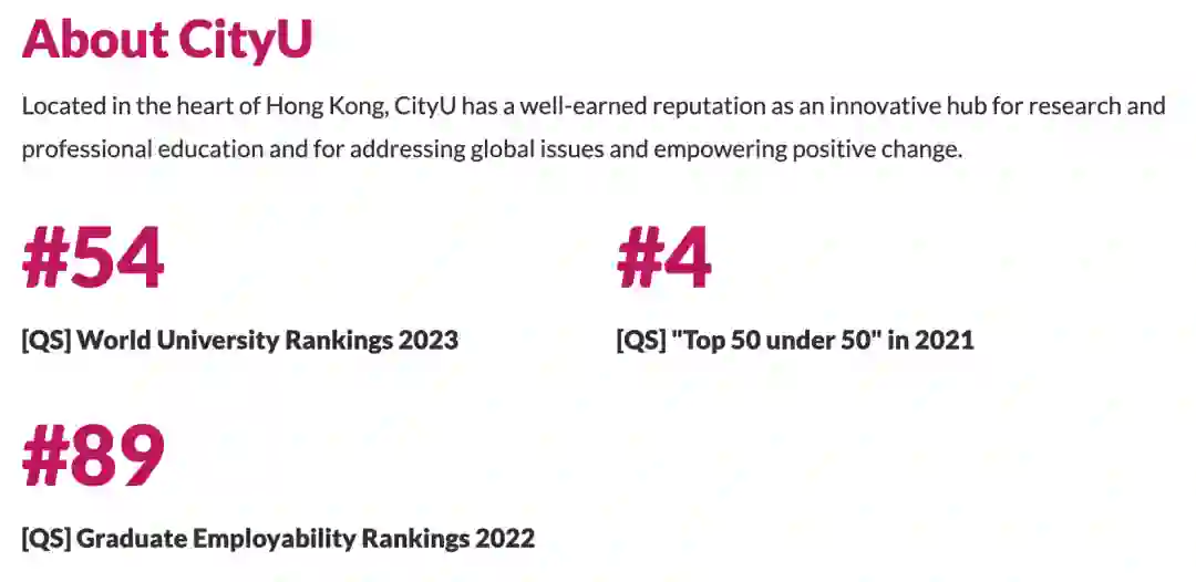 香港城市大学是一所世界知名的国际化公立研究型综合大学,坐落于香港九龙塘。作为全球领先的大学,城大秉承新理念,并不断寻求新方法来改善世界。在 2023 QS 世界大学排名中,香港城市大学排第 54 名,建校未满 50 年最佳大学第 4 名。