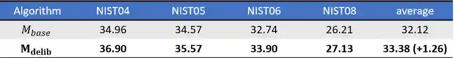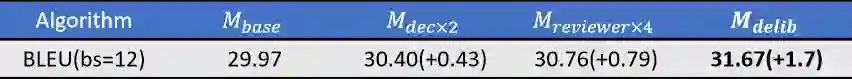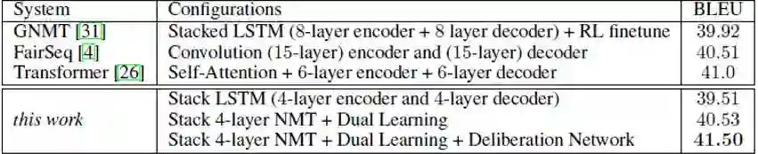 (1)神经机器翻译(NMT),即用神经网络来将源语言的句子翻译到目标语言。标准的 NMT 模型由一个编码器(用于编码源句子)和一个解码器(用于生成目标句子)组成,因为可以使用我们提出的推敲网络加以改善。在WMT' 14 英语→法语数据集上基于广泛应用的单层GRU模型上实验结果表明:相比于没有使用推敲的模型,使用推敲可以将BLEU分值提升 1.7。我们还在汉语→英语翻译上应用了我们的模型,并且在 4 种不同的测试集上平均实现了 1.26 的BLEU提升。此外,在 WMT' 14 英语→法语翻译任务上,通过将推敲应用于深度LSTM模型,我们实现了 41.50 的BLEU分值,这个成绩是这一任务的全新纪录。