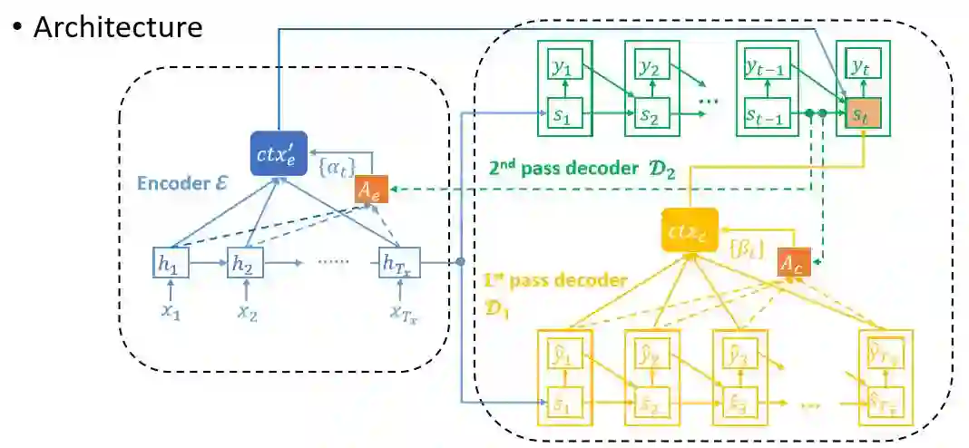 尽管该框架已经取得了很大的成功,但还存在一个问题:在生成词的时候只能利用生成的词而不是未来的尚未生成的词。也就是说,当解码器生成第t个词y_t时,只使用了小于t的y,而没有明确考虑大于t的y。相反,真实的人类认知过程会以一种迭代式刷新的方式利用包含过去和未来部分的全局信息。这里给出两个例子:(1) 思考一下当我们在阅读一个句子时在句子中间遇到了一个不认识的词。我们不会在此就停止阅读。相反,我们会继续读完这个句子。然后我们回到这个未知词并试图使用其上下文(包括该词之前和之后的词)来理解它。(2)在书写一份好的文档(或段落、文章)时,我们首先会创建一个完整的草稿,然后再根据对整个草稿的全局理解来进行润色。当润色一个特定部分时,我们不会只看这部分之前的内容,而是会考虑这个草稿的全局,从而评估这里的局部元素与全局环境的契合程度。