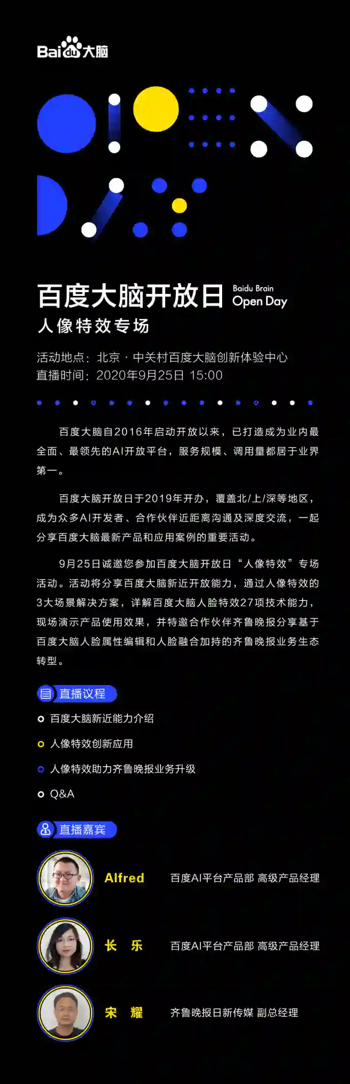9月25日诚邀您参加百度大脑开放日“人像特效”专场活动。活动将分享百度大脑新近开放能力,通过人像特效的3大场景解决方案,详解百度大脑人脸特效27项技术能力,现场演示产品使用效果,并特邀合作伙伴齐鲁晚报分享基于百度大脑人脸属性编辑和人脸融合加持的齐鲁晚报业务生态转型。