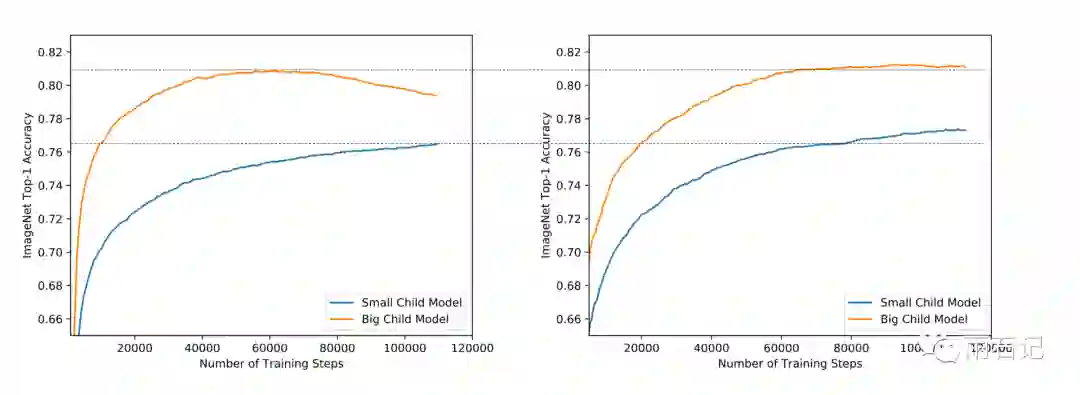 在实验中,发现大模型和小模型的收敛行为很不一致,大模型过拟合了小模型才刚刚收敛,如下图左。