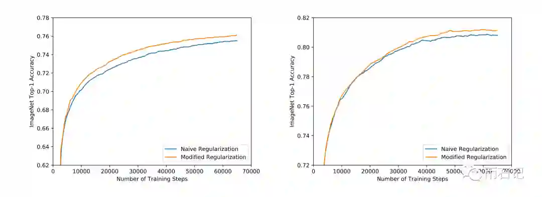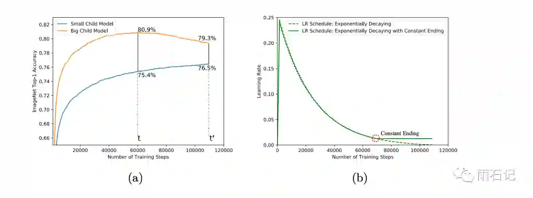 为了解决这个问题,对学习率进行了改进,将其变为指数衰减+常量结尾,即最后的学习率是一个常量,常量值是最初值的5%。如上图右。有了更大的学习率后,大模型会在最优解上左右摇摆,但不会过拟合,小模型会加快收敛。从而解决这个问题。