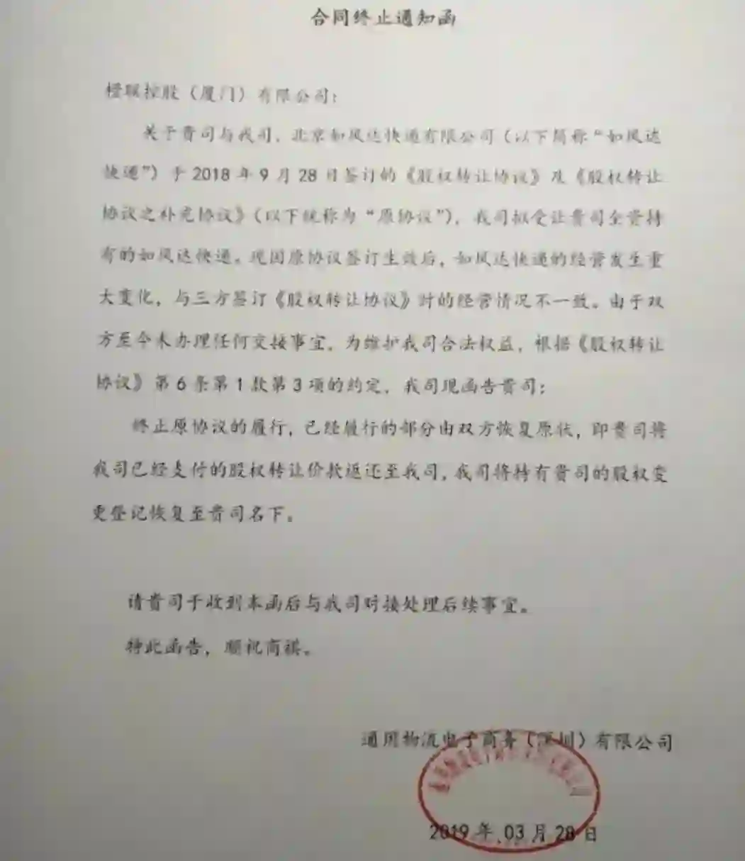 当天,深圳通用物流发布了一则“合同终止通知函”。