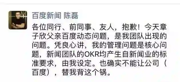 7月14日,针对百度账号“章子欣父亲发文造假”一事,百度新闻负责人陈磊在微信朋友圈表示:各位同行、前同事、友人,抱歉!今天章子欣父亲百度动态问题,是我团队出现的问题。凭良心讲,我的管理问题是核心问题,新闻团队的OKR均产生自新闻业的标准要求,由我设定。也确实不能让公司(百度),替我背这个锅。