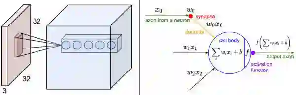 右边:神经网络章节中介绍的神经元保持不变,它们还是计算权重和输入的内积,然后进行激活函数运算,只是它们的连接被限制在一个局部空间。