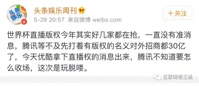 据传,在优酷与央视签约之前,腾讯体育的谈判正热烈进行。业内有消息称,腾讯此前出价11亿欲拿下世界杯直播权,但此事还未能尘埃落定之际,腾讯就已经打着有版权的名义,招商超过30亿。