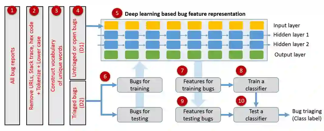 该方法和传统的自动归类 bug 通道不同,(i) 步骤 4 中,考虑了未归类的 bug(D1)(在传统方法中完全被忽略),(ii) 基于深度学习的 bug 报告表征取代了 BOW 表征。步骤 4 和 5 的添加,使得可以自动从数据本身而不是通过手工工程学习 bug 报告表征。