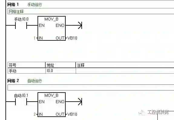 1、PLC和上位机(或触摸屏)组成监控系统时,在画面上很多时候需要有“手动”、“自动”等控制模式(一般都是多个只能一个时)。在程序里面可以用“MOV”指令。如:当选择“手动”就将常数1 MOV到一个寄存器VB10里面,当选择“自动”就将2 MOV到同一寄存器VB10。只要判断寄存器的数据是多少,就知道系统是那种控制方式。这样的思路好处是容易理解,不需要互锁之类的麻烦程序。