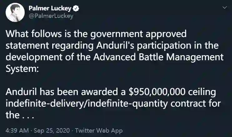 9 月 25 日,Palmer Luckey 在推特上宣布,Anduril 已成为美国空军先进作战管理系统(ABMS)的供应商之一。其他供应商还包括 AWS 以及 16 家鲜为人知的公司。