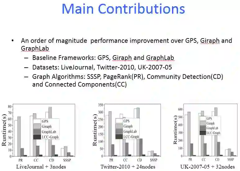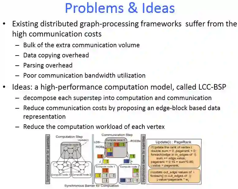 大规模同步并行(BSP)模型对编码和调试并行图算法是用户友好的。然而,现有基于BSP的分布式图处理框架,例如Pregel,、GPS、Giraph,总是受高通信开销的困扰。高通信开销主要源于细粒度的消息传递通信模型。为了解决高通信开销问题,我们提出一种低通信开销的计算模型,即LCC-BSP,并利用该计算模型现实一个高性能的分布式图处理框架LCC-Graph。该图处理框架显著地降低通信开销。它还通过优化图分割方法平衡了计算结点间的计算负载,显著地缩短了每个超步的计算时间。我们在一个由32个计算结点组成的集群上用用现实世界的图对LCC-Graph进行测试。实验结果表明:该图处理框架的速度明显快于现有的分布式图处理框架,尤其是当系统运行在高带宽网络之上时,性能提升更明显,例如,LCC-Graph比GPS和GraphLab快一个数量级。
