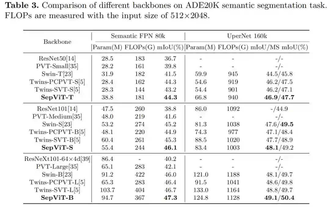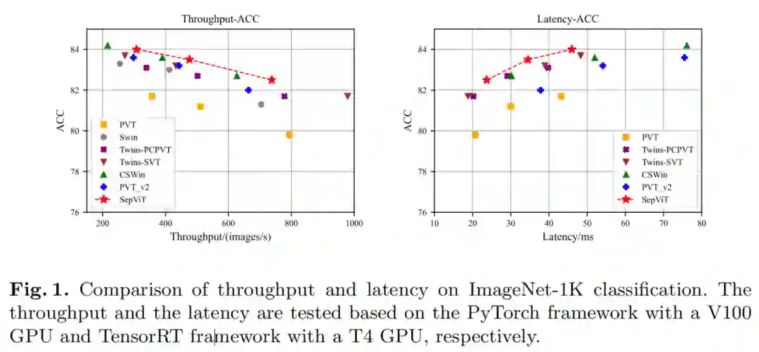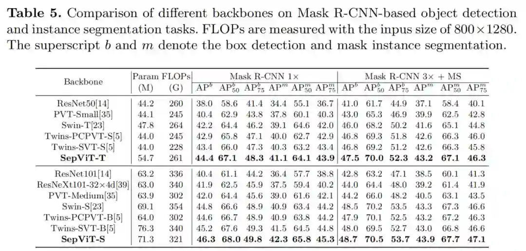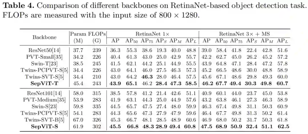 在各种基准测试任务上进行的大量实验表明,SepViT可以在准确性和延迟之间的权衡方面达到最先进的结果。其中,SepViT在ImageNet-1K分类上的准确率达到了84.0%,而延迟率降低了40%。在下游视觉任务中,SepViT在ADE20K语义分割任务达到50.4%的mIoU,基于RetinaNet的COCO目标检测任务达到47.5AP,基于Mask R-CNCN的48.7 box AP检测和分割任务实现43.9 mask AP。