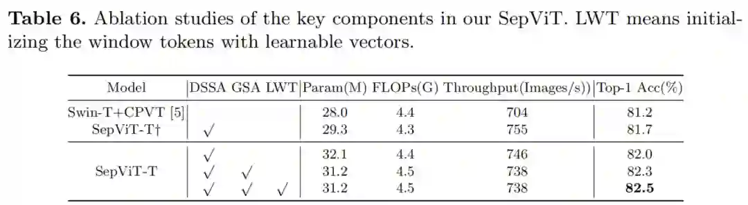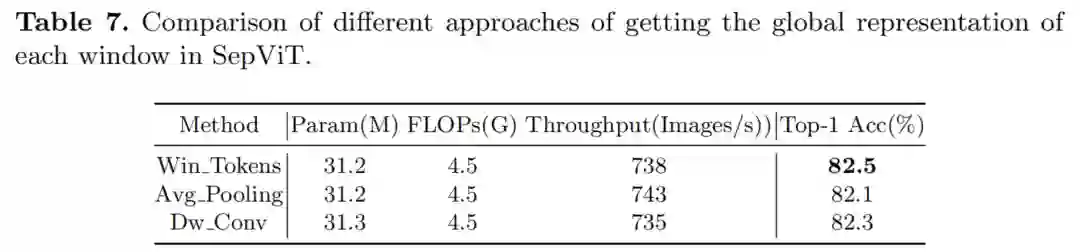 进一步研究了用固定的零向量或可学习向量初始化Window Token是否会有影响。与固定的零初始化方案相比,可学习的Window Token帮助SepViT-T将性能提高到82.5%,如表6的最后一行所示。