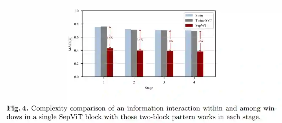 我们比较了我们提出的SepViT块与其他两个SOTA块(Swin,Twins)的复杂性。正如之前所述,Window内和窗口之间的信息交互是在一个SepViT块中完成的,而Swin和Twins需要两个连续的块。