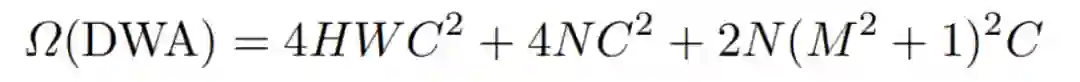 在基于Window的Self-Attention的基础上,DWA具有类似的计算成本。此外,Window Token的引入将会导致额外的成本,但与DWA的总成本相比,这一点可以忽略不计。DWA的复杂度计算方法如下: