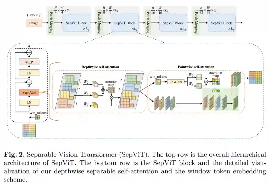 为了解决这些问题,作者受深度可分离卷积启发设计了深度可分离Vision Transformers,缩写为SepViT。SepViT通过一个深度可分离Self-Attention促进Window内部和Window之间的信息交互。并群欣设计了新的Window Token Embedding和分组Self-Attention方法,分别对计算成本可忽略的Window之间的注意力关系进行建模,并捕获多个Window的长期视觉依赖关系。