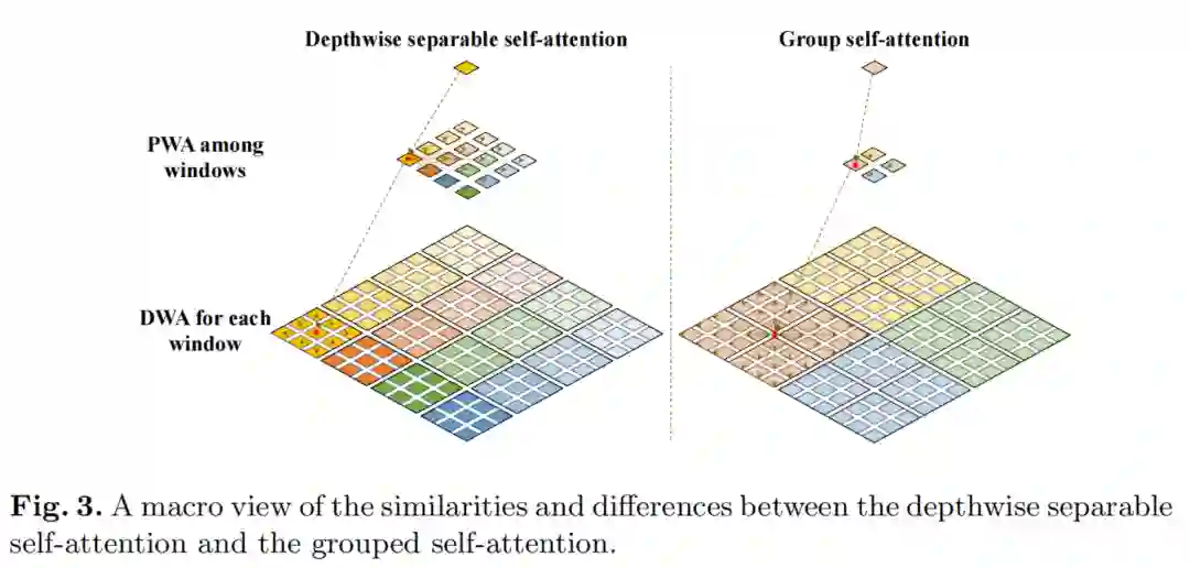 此外,为了得到局部Window的全局表示开发了一种新的Window Token Embedding方法,该方法可以在极小的计算代价下模拟Window间的注意力关系。此外,还将AlexNet的分组卷积思想扩展到深度可分离Self-Attention,并提出了分组的Self-Attention以进一步提高性能。