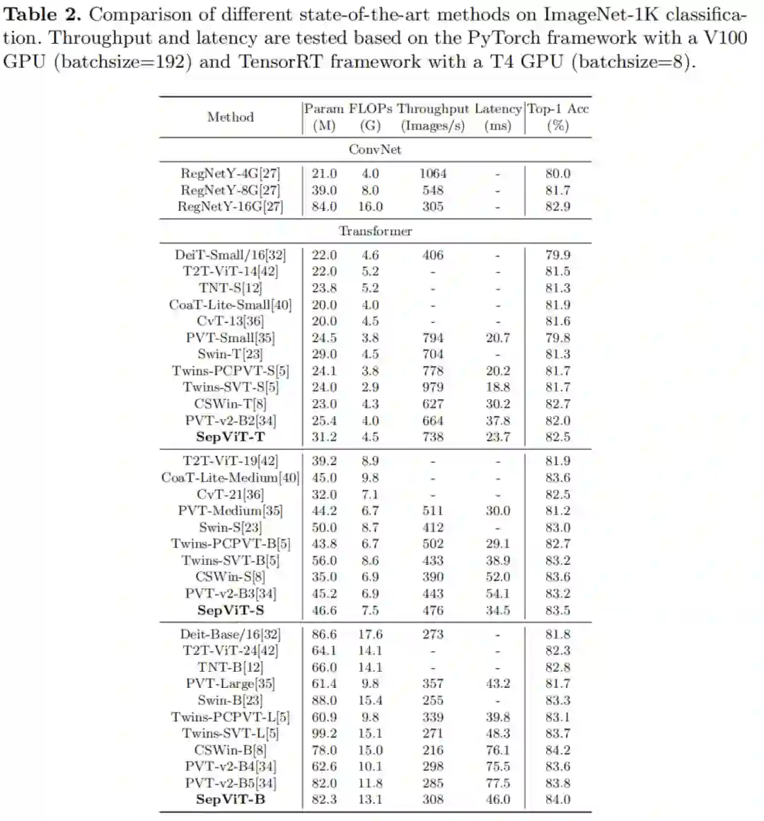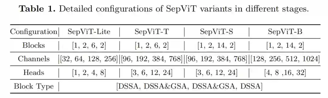 为了与其他vision Transformers进行公平的比较,作者提出了SepVit-t(Tiny)、SepVit-s(Small)和SepVit-b(Base)变种。