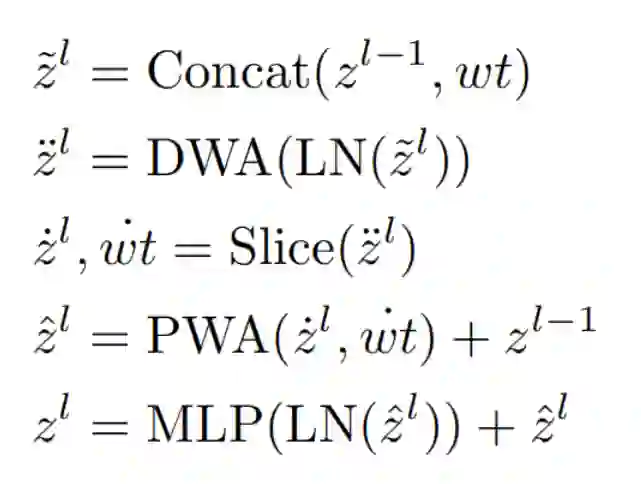 其中,¨zl、ˆzl和zl分别表示DWA、PWA和SepViT块l的输出。˙zl和˙wt是特征映射和学习到的窗口令牌。Concat表示连接操作,而Slice表示切片操作。