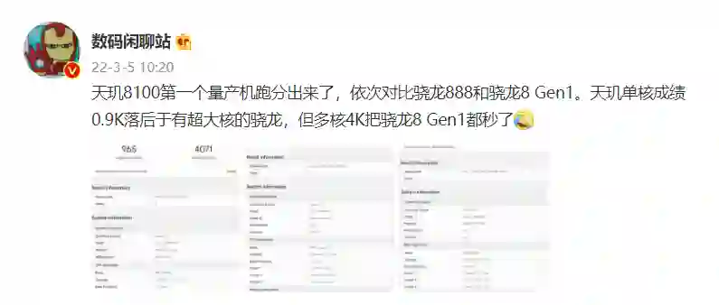 对比搭载骁龙 8Gen1 的 realme RMX3310 新机来看,天玑 8100 的单核成绩落后于高通旗下的骁龙 8 Gen 1,原因为骁龙 8 Gen 1 拥有超大核,但多核成绩要远胜于高通(RMX3310 跑分为 1129 分和 3538 分)。