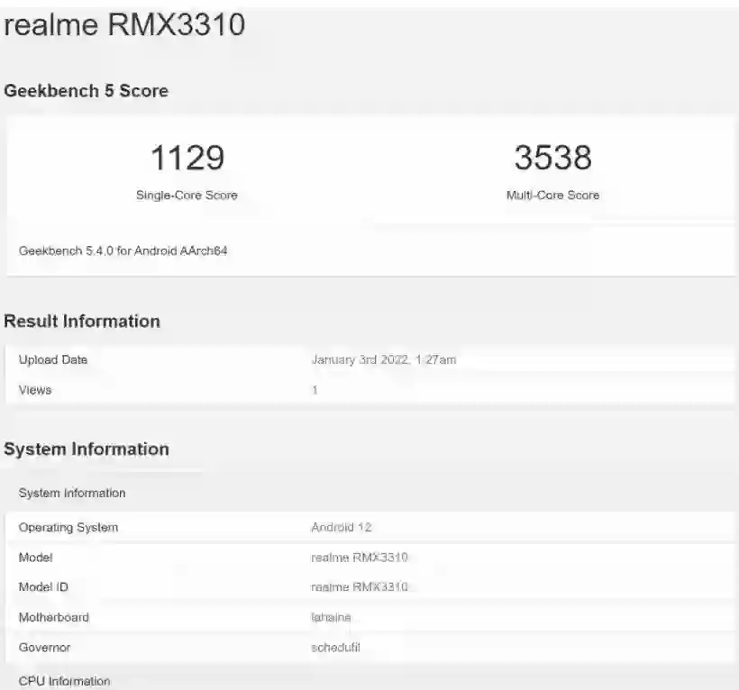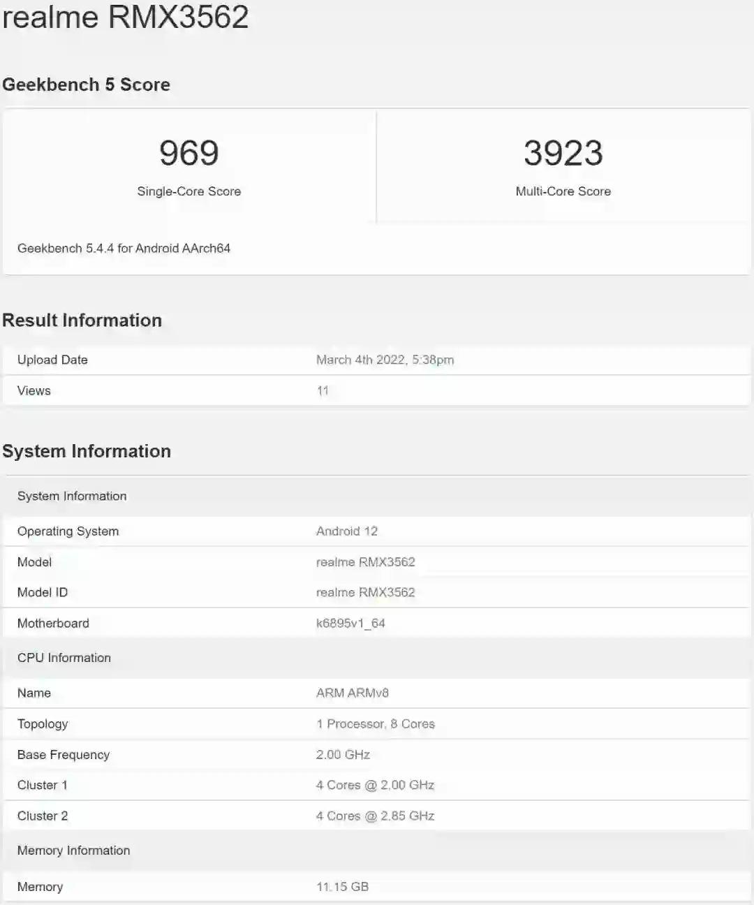 据媒体报道称,一款型号为 RMX3562 的 realme 新机亮相 Geekbench 跑分平台。该机单核跑分成绩为 969 分,多核成绩 3923 分,手机搭载 12GB 运行内存和 Android12 操作系统。据知名爆料博主@数码闲聊站 称,这也是首款搭载天玑 8100 处理器的量产机。