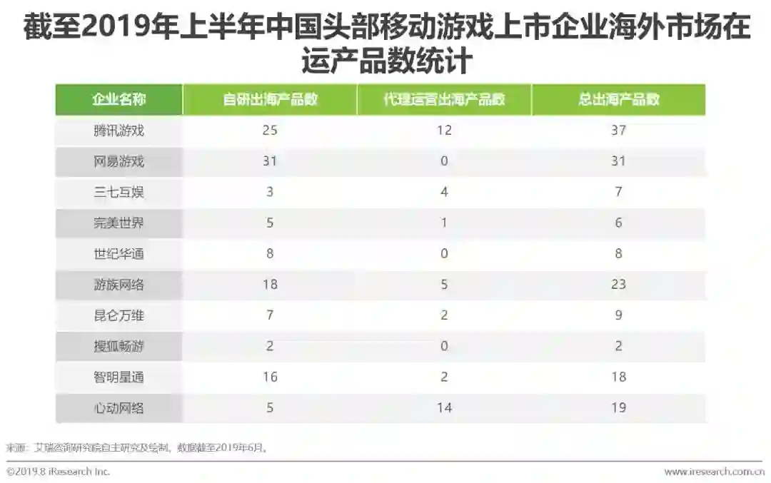 2018年起,在市场背景的推动下,我国头部移动游戏企业纷纷开始布局海外。下表中统计了截至2019年6月,我国头部移动游戏上市企业在海外应用商店(除中国大陆及港澳地区)仍在运营的产品总款数。