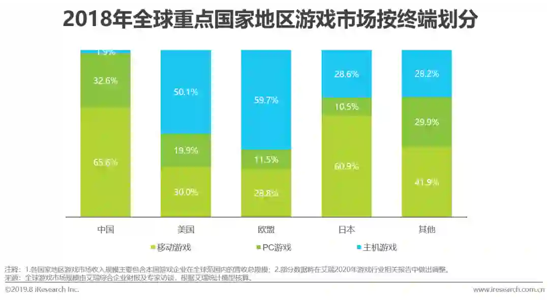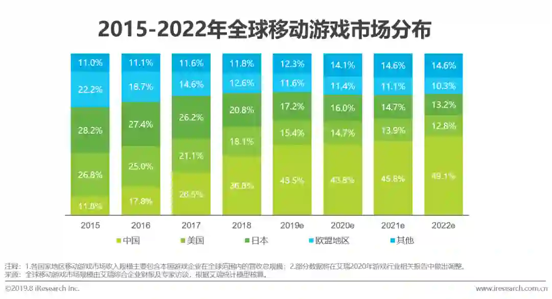 而在美国及欧盟地区,移动游戏市场的行业总占比尚不足30%。