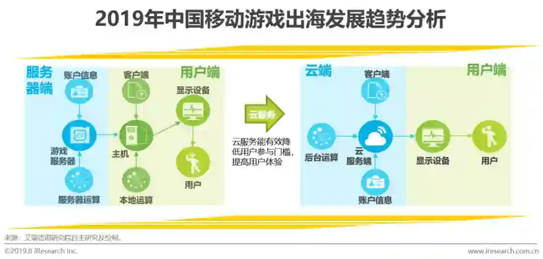 如下图所示,在云服务器功能的支持下,原本由用户端设备主机承担的游戏本地运算及客户端下载等功能均可以转接到线上的云服务端,由云服务器代为完成。在此背景下,移动游戏将仅对用户移动终端设备的联网功能拥有刚性需求,而对于设备主机的性能要求将大幅度降低。因此,可以认为云服务的引入将有效降低用户参与游戏的硬件要求。而为了能够顺利拓展一些欠发达地区市场,云服务技术的引入在未来势必将成为游戏出海行业技术攻坚的重要一环。