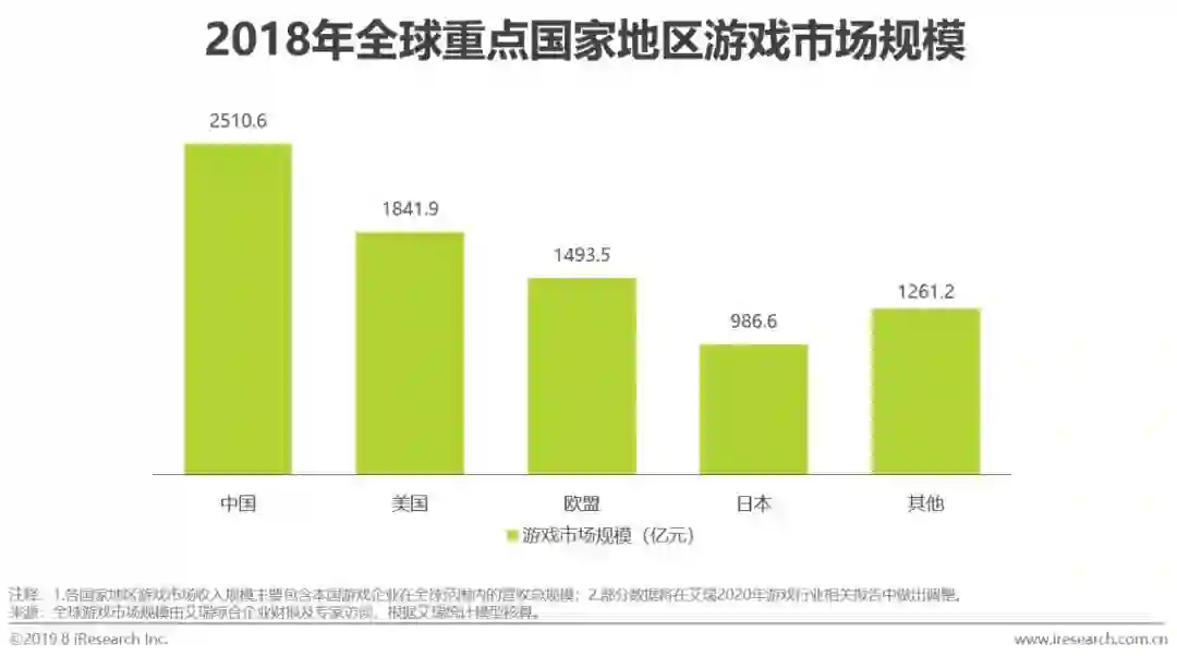 2018年,中国游戏市场全年收入达2510.6亿元人民币,市场总规模领先全球,而美国、欧盟及日本分列2到4位。