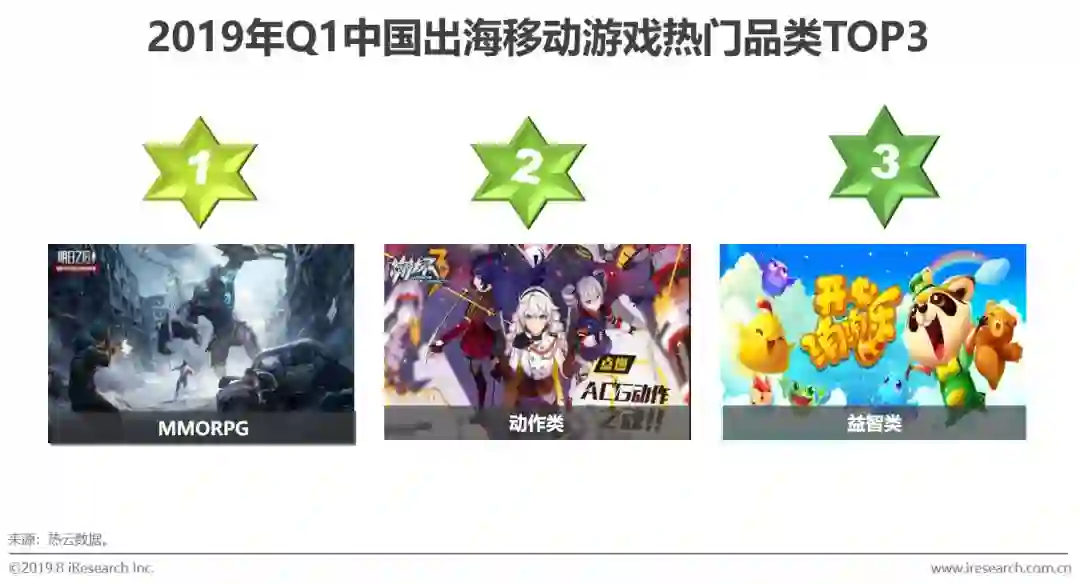 在游戏品类方面,虽然在不同地区榜单中的排名顺序会稍有出入,但总体而言,MMORPG、动作类及益智类三类游戏已经成为2019年Q1中国出海移动游戏投放最热门的三大品类。其中MMORPG与动作类游戏是偏重度的游戏品类,而益智类游戏多以轻度游戏为主。由此可见,海外市场对中国国产游戏的需求十分多元化,且中国国产游戏在多品类、玩法的产品中都已经能够得到海外市场的认可。