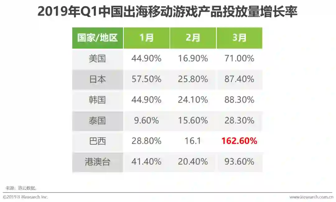 据热云数据统计显示,2019年1-3月,中国出海移动游戏产品在美国、日本、韩国等多个海外热点市场中的投放数量均获高速增长。其中仅2019年3月,中国出海移动游戏在巴西市场的产品投放的增速就高达162.6%。此外,在东南亚的泰国市场,中国企业的投放力度也正在逐月递增。海外发展中地区市场正成为中国游戏厂商近期着重布局的市场板块。