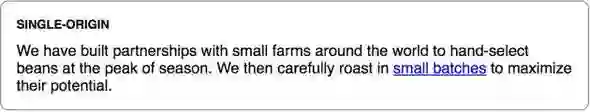We have built partnerships with small farms around the world to hand-select beans at the peak of season. We then carefully roast in <a href="/batch-size">small batches</a> to maximize their