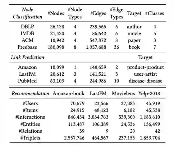 HGB 收集了在 3 个任务上共收集了 11 个中等规模异构图数据集,三个任务分别是节点分类、链接预测、基于知识图谱的推荐,相关数据集的统计信息如图所示:
