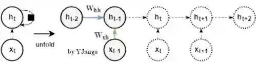 动态图:左侧是时间维度展开前,回路方式的表达方式,其中黑方框表示时间延迟。右侧展开后,可以看到当前时刻的并不仅仅取决于当前时刻的输入