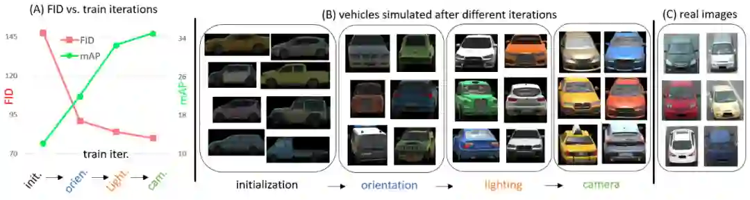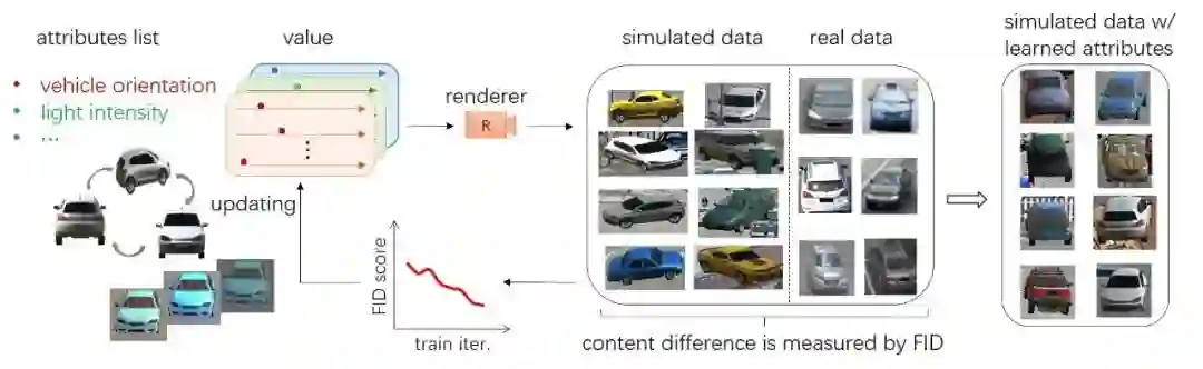 给定一个属性列表(角度,相机,光照),我们使用渲染器进行车辆3D渲染。然后,我们计算合成数据和实际车辆之间的Frechet inception distance (FID),FID是一个通用的domain gap的衡量指标,最早被用在gan生成图片质量的衡量。