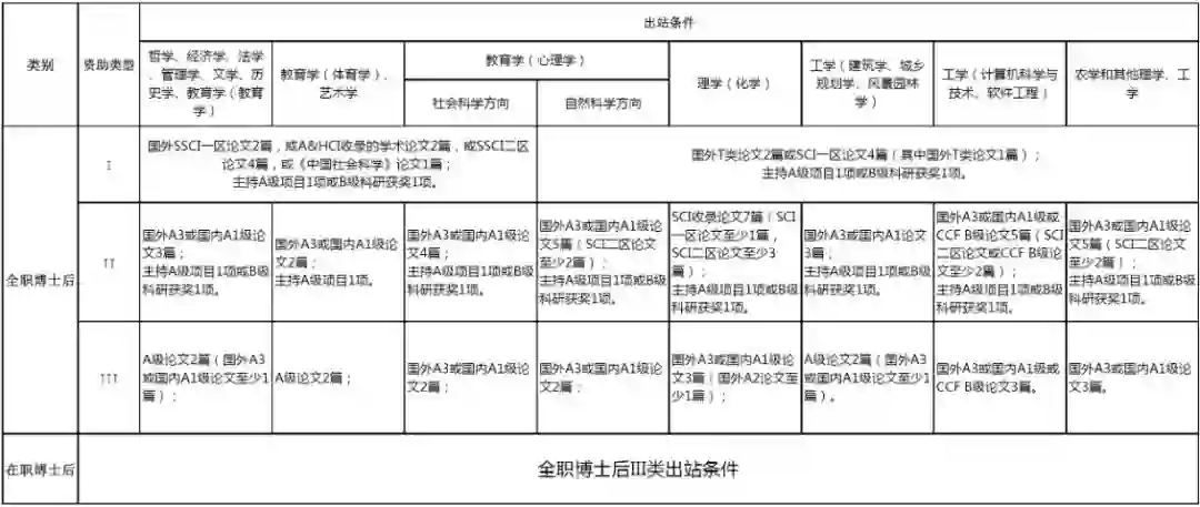 3.出站时西南大学根据工作绩效(博士后出站条件分为Ⅰ、Ⅱ 、Ⅲ,具体见文尾)发放津贴。满三年出站达到Ⅰ类出站条件学校一次性给予71.2万元(满2年出站80.8万);达到Ⅱ类出站条件一次性给予31.2万(2年出站40.8万);达到Ⅲ出站条件一次性给予1.2万(2年出站10.8万)。在2-3年期间出站的,按照实际在站时间、出站类别及相应类别学校提供经费核算。按照全职博士后达到Ⅰ类、 Ⅱ 类出站条件的,通过学校师资选留程序优先留校工作,并按照引进人才类型享受相关待遇。