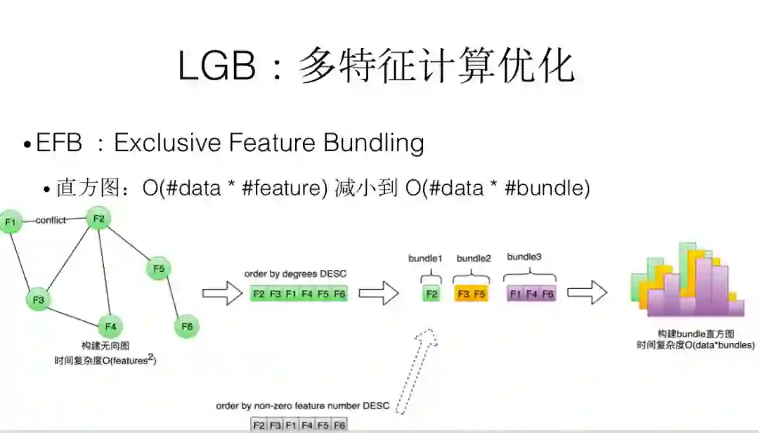 针对 feature 比较多的,它会把很多 feature 绑在一起,这个背后思考是什么?因为我们在进行分裂的时候,我会变 N 个 feature,如果有些 feature 它们共现程度不是很高,我就可以把这几个 feature 绑在一起。比如 A 和 B 两个共现程度不高,在分裂的时候可以把这两个 feature 绑定在一起考虑。整个算法分为四步,首先构建一个无向图,根据任意两个 feature 之间的冲突或贡献的次数,在这个无向图里我们会根据度进行降序排列。如果加入一个新 feature 的时候,它对应的冲突个数大于一个阈值,我们就新开一个 bundle。