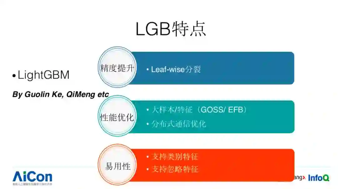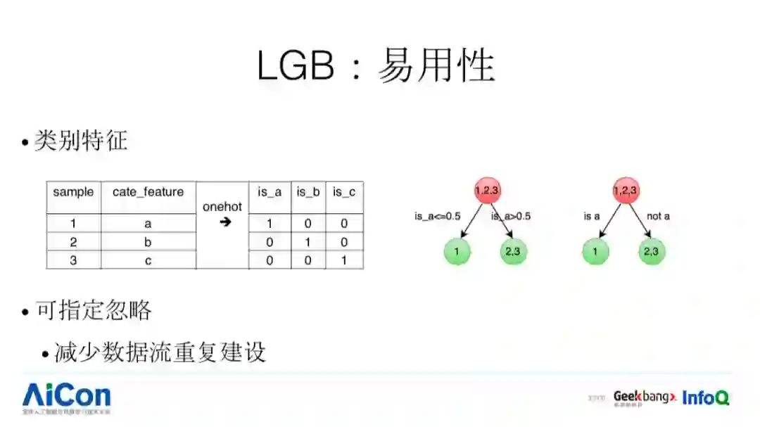 我们再看 LGB 易用性。传统的类别特征(见 PPT),可指定忽略。这样的特点在实际业务应用过程会带来什么样的好处呢?例如我们要调研多个特征的时候,我们就可以建一条数据流,通过制定忽略的方式,得到不同特征的调研结果,这样可以减少数据流建设的成本。