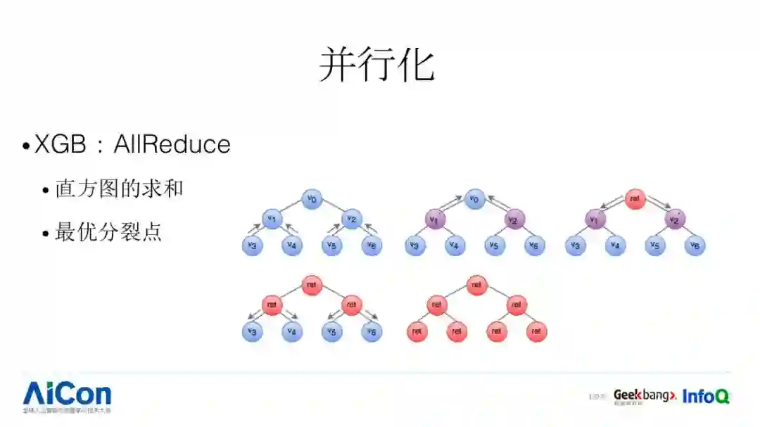 整个 AllReduce 有两个过程 bottom up 和 bottom down, 完成本地计算之后,我们需要把多个本地计算结果挑出全局最优特征,这个在 XGB 里面也是基于 all reduce 实现的。在 LGB 里面使用 all Gather。假设我们有四个节点,第一步 R1 给 R0,第二步 R2 同步给 R0,这个时候 R0 的 V0 是自己的,V2、V3 从 R2 拿的,五个节点的内容 R0 知道了四个。最终通过补全的方式,比如 R4 把剩下的几个结果一一补到对应的位置上去,通过这样的过程,每个节点都知道整个集群里面我对应的结果是怎么样。然后我在本地做一次 reduce 操作,这样每个节点都知道全局的结果。