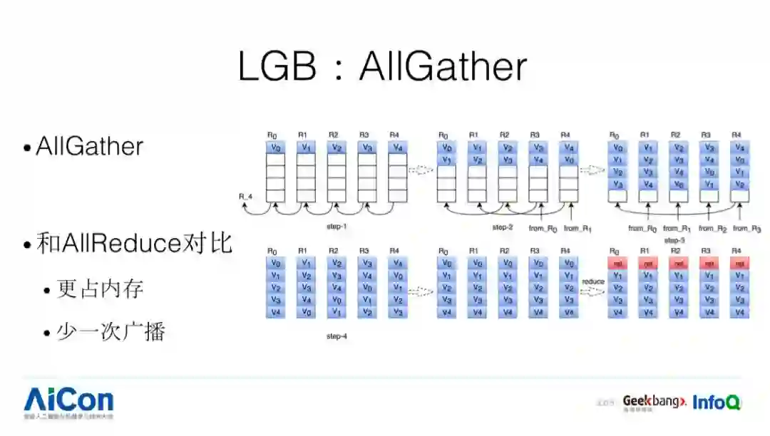 第二步,把这个结果告诉其他的 worker,这是一个 bottom down 的过程。每个节点接受父亲节点的结果,同时往下进行分发。AllReduce 的方式是大规模分布式的 Batch Learning 中最常用的通信方式。接下来我们看看 LGB 针对这块做了哪些优化。